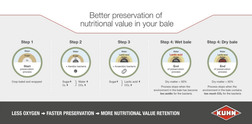 Så jo mindre oksygen du fanger i ballen under ensilering, desto raskere konservering og desto mer næringsverdi beholdes. Oksygeninntrengning under lagring, for eksempel ved deformering av ballen eller skade på filmen, bør også forhindres. Ellers starter konserveringsprosessen og dermed tapet av næringsverdi på nytt.