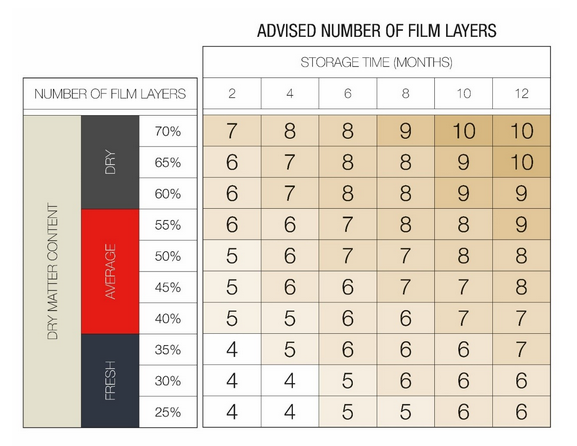 Å bruke seks eller åtte lag film som standard for å sikre at ballen er tilstrekkelig forseglet og beskyttet er ofte det man ser i praksis. Men ulike faktorer påvirker antallet filmlag rundballen faktisk trenger. Retningslinjen er: jo tørrere avlingen er, jo flere lag med film. Hvis avlingen er våt, er det sannsynligvis greit å bruke færre lag med film til pakking. I tillegg til fuktinnhold er den tiltenkte lagringstiden en viktig faktor. Tross alt, jo flere lag med film, jo bedre oksygenbarriere, så oksygen bruker lengre tid på å nå fôret i ballen. Se tabellen nedenfor for våre anbefalinger1:
