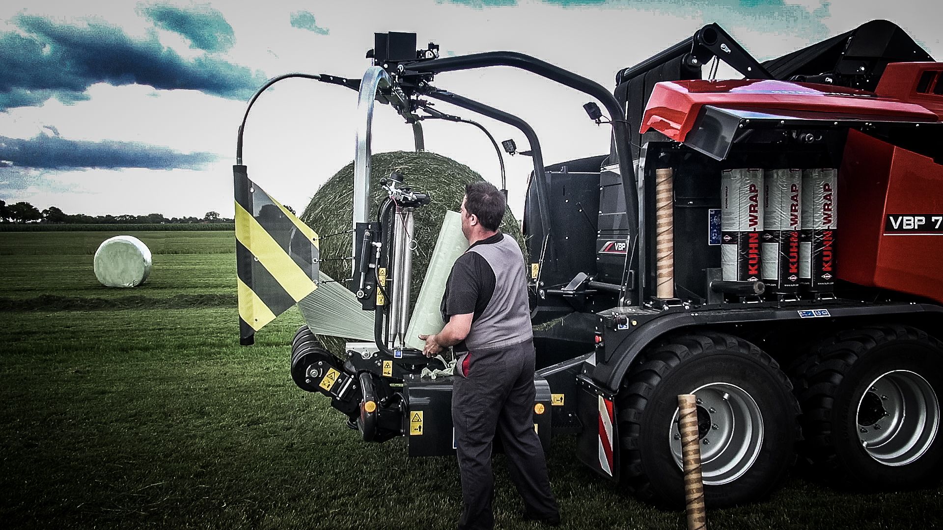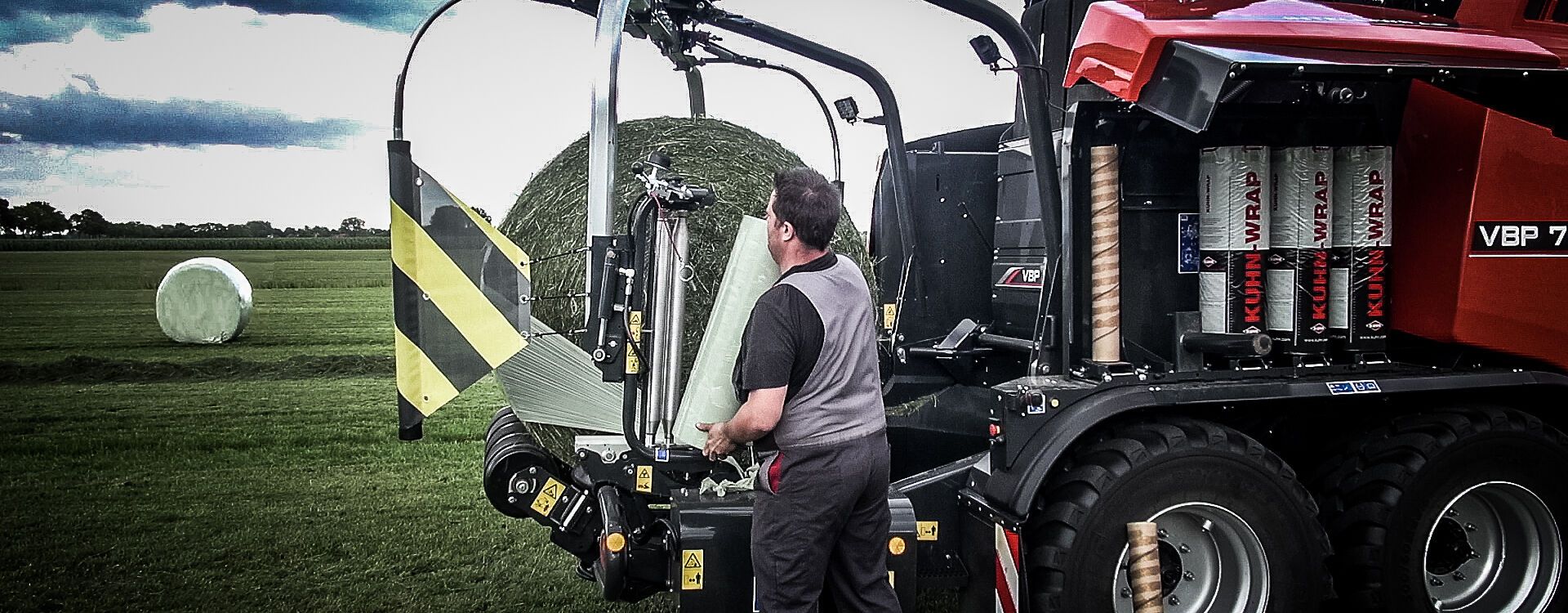 Med FBP- og VBP-modellene kan filmrullene tas ut av filmmagasinene fra en komfortabel arbeidshøyde. Filmrullene på satelittarmene er også i en praktisk høyde. Den koniske utformingen av forstrekkrullene skaper et praktisk sted for å sette inn og plassere strekkfilmen. Endene av de to filmrullene kan klemmes fast i en spesiell holder på pakkebordet for å holde dem fast i starten av innpakkeprosessen. De frigjøres deretter umiddelbart, slik at det ikke blir igjen filmrester på maskinen eller på jordet. Når begge filmrullene er byttet ut og de tomme rullene er lagret, kan føreren raskt fortsette å presse og pakke rundballer.