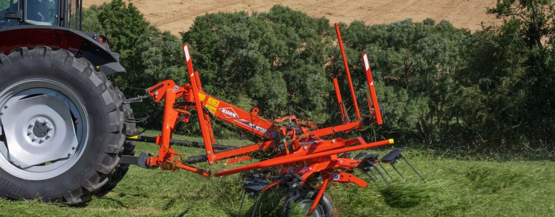 GF 5903, GF 7903, GF 8703 og GF 10803 sprederive er enkle, hydraulisk sammenleggbare, kostnadseffektive verktøy med 4 til 8 rotorer og arbeidsbredder fra 5,20 m til 7,80 m. De er den perfekte sprederiven for bønder med relativt små arealer å teste årlig. Den kompakte maskinen er spesialdesignet for optimal trafikksikkerhet. KUHNs DIGIDRIVE-system og rotorgirkasser er smurt for livet, noe som holder vedlikeholdstiden nede på et minimum. Velg en sprederive med stor rotor for å arbeide i langt og tett fôr, og en sprederive med liten rotor for kort fôr, med jevn avlingsvending og raskere tørking. GF 8703 og GF 10803 sprederiver har henholdsvis 8 og 10 rotorer, og arbeidsbredder på 8,70 m og 10,80 m. Smale plott og punkter er ingen problemer takket være HLC rotorløftsystem (Headland Lift Control). Bare aktiver ventilen for å løfte alle rotorene til minimum 50 cm fra bakken, på mindre enn 5 sekunder. Hele denne serien av sprederive er utstyrt med de samme velprøvde komponentene som har gjort KUHN-sprederive til et must-ha-verktøy, når det gjelder fôrkvalitet og kompakt design, i mange år.