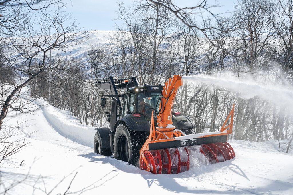 Fresen var montert på en Valtra T-235, en traktor som passer godt til denne typen arbeid. Traktoren kombinerer høy effekt med god stabilitet og driftssikkerhet, noe som er viktig når utstyret jobber tungt over tid i krevende terreng og vanskelige snøforhold. I slike oppgaver er det avgjørende å ha en traktor som både har kapasitet til å bære og drive utstyret, og samtidig gir føreren god kontroll gjennom hele arbeidsøkten.